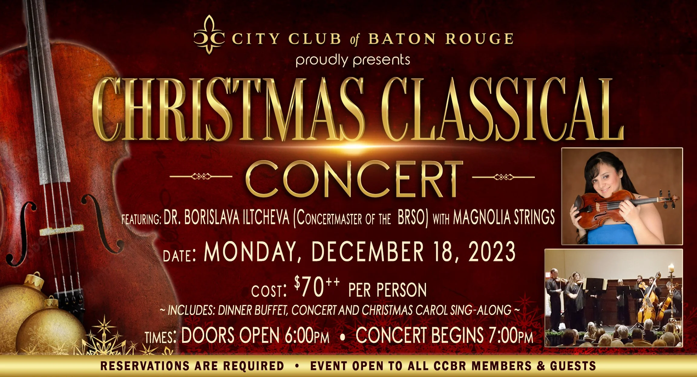 Share in the joy of the holiday season with DR. BORISLAVA ILTCHEVA (Concertmaster of the BRSO) and MAGNOLIA STRINGS.