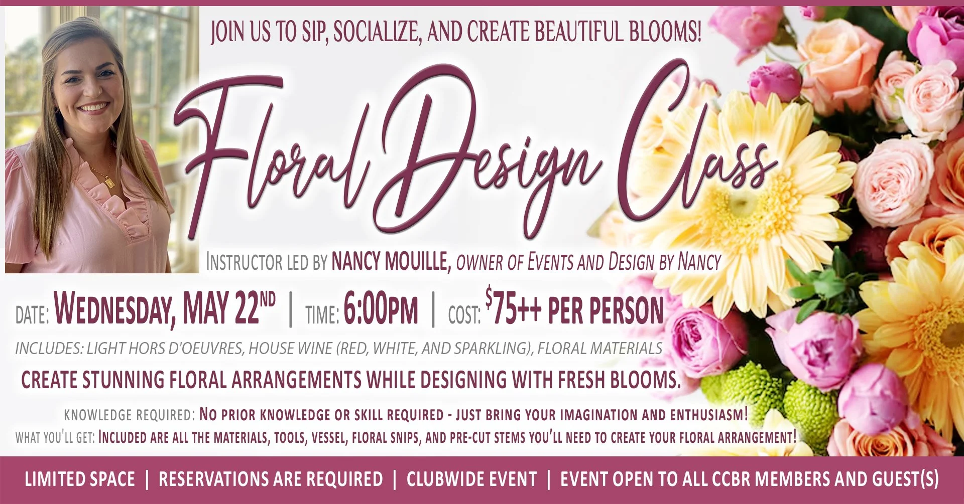 Nancy will guide you through the process, providing tips and tricks to help you unleash your inner florist. Whether you're a beginner or have some experience, this class is perfect for anyone looking to add a touch of beauty to their home or special events.