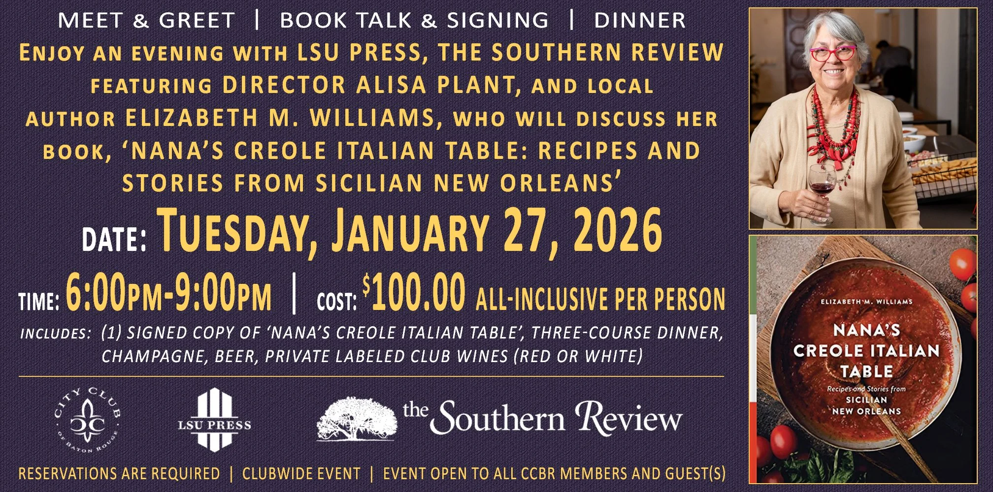 Attendees will receive a complimentary signed copy of Nana’s Creole Italian Table: Recipes and Stories from Sicilian New Orleans while enjoying great food, engaging discussions, and the opportunity to connect with fellow enthusiasts!