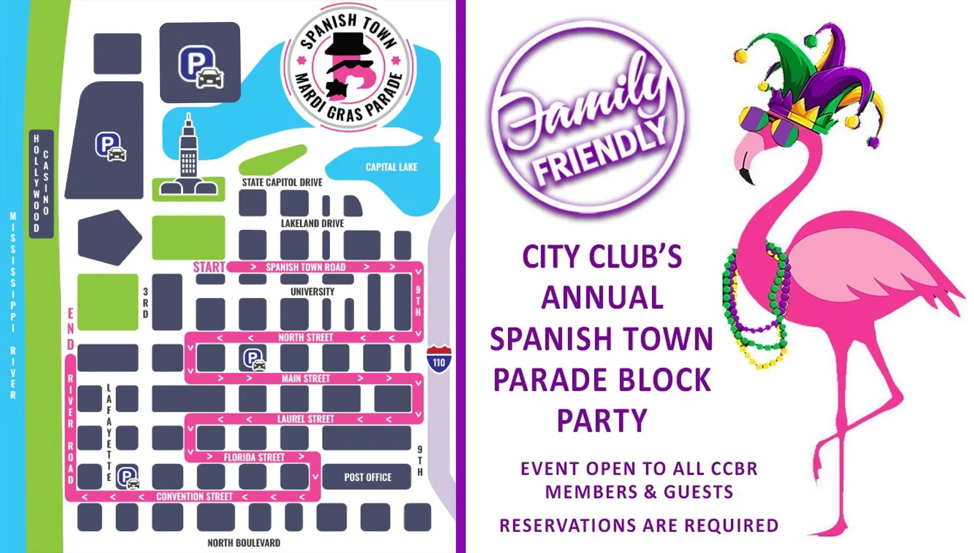 PARKING: Please note that parking will not be available at the Club. We suggest you consider one of the following for alternate parking options for the Spanish Town Parade Block Party: