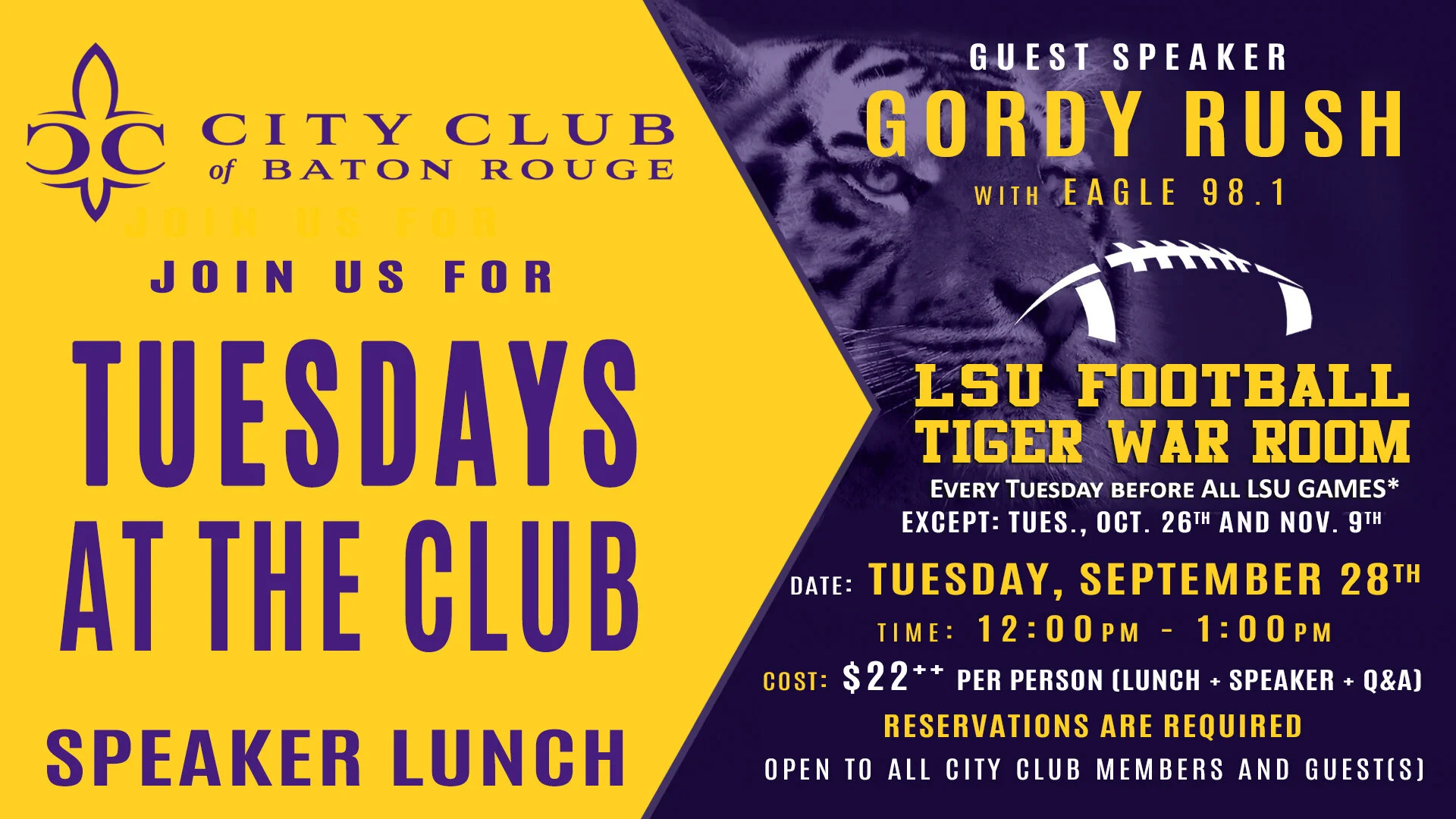 Tues., Sept. 7 thru Nov. 23, 2021 - Tiger War Room with Gordy Rush of Eagle 98.1 - Tiger Fans - Every Tuesday Before All LSU Games – Except on Tues., Oct. 26th and Nov. 9th. cost: 22.00++per person (Lunch + Speaker + Q&A)